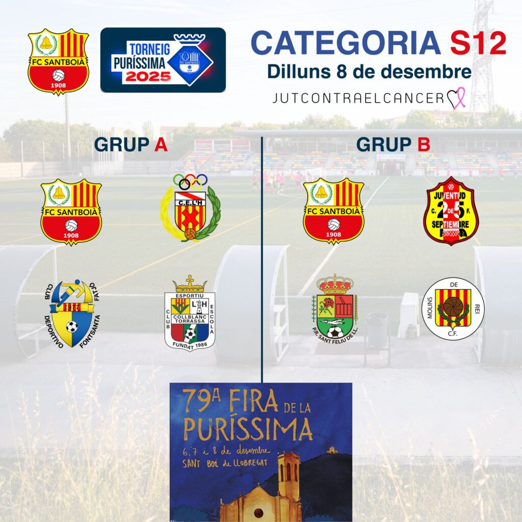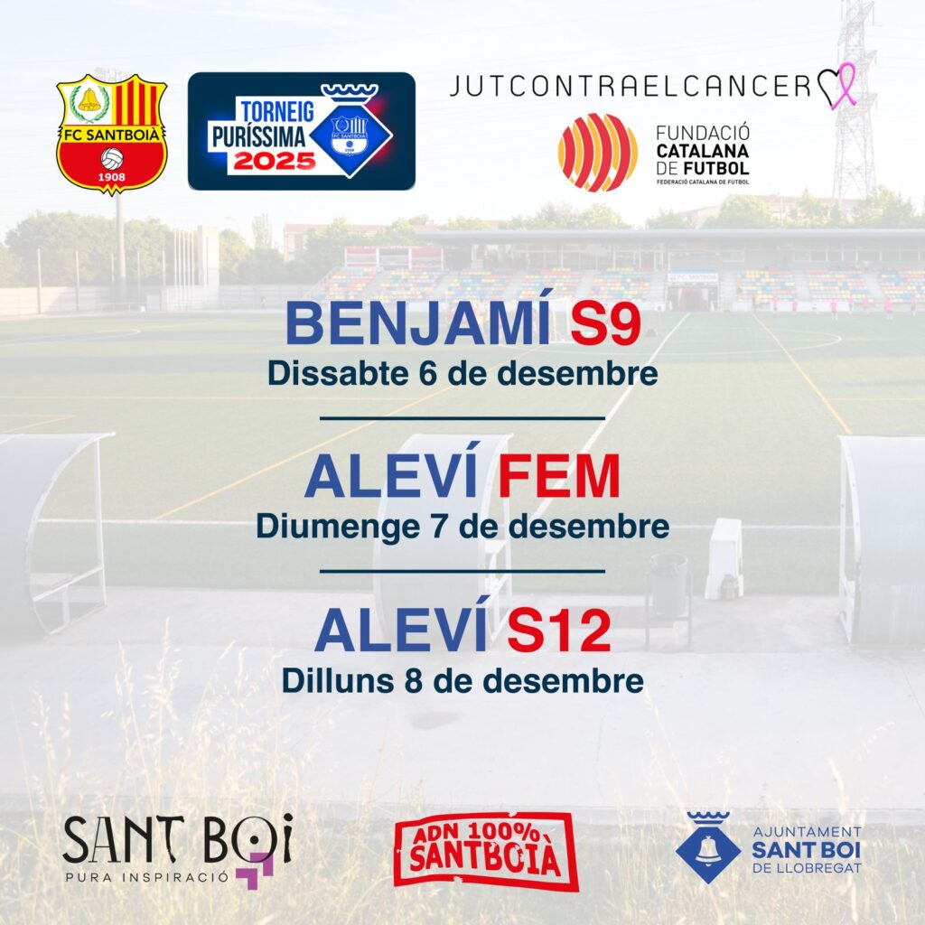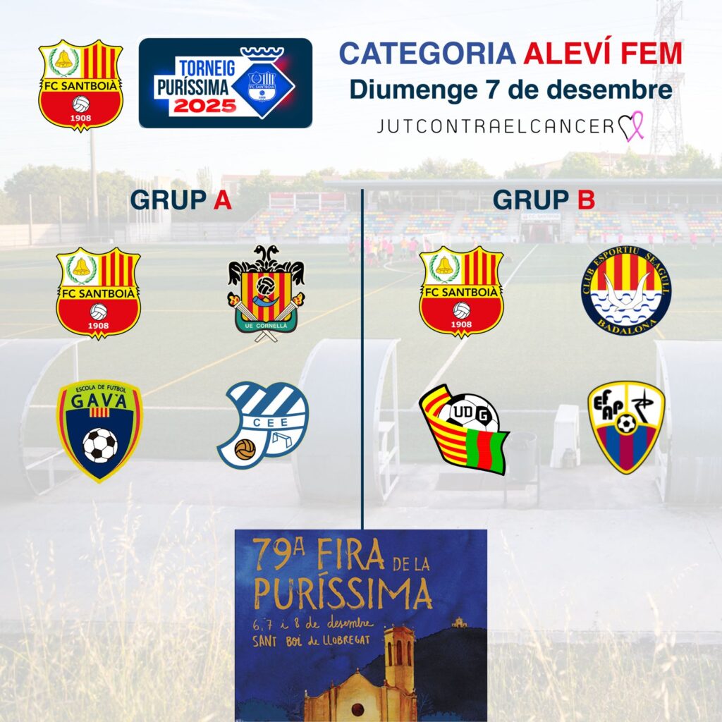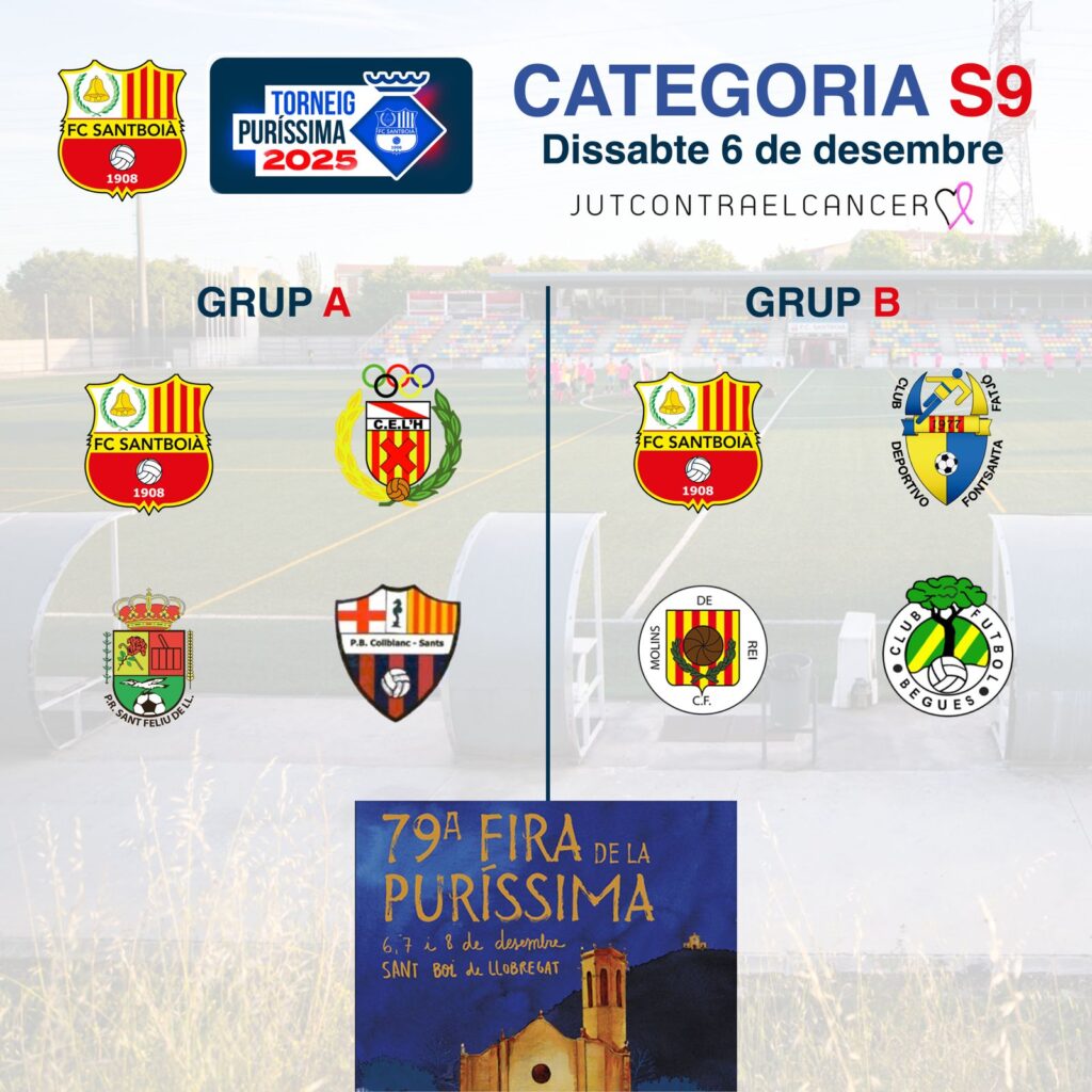 Com cada any, els propers 6, 7 i 8 de desembre al FC Santboià organitzem el Torneig Puríssima! Enguany, les categories Benjamí S9, Aleví Femení i Aleví S12 seran les protagonistes durant els tres dies de torneig!